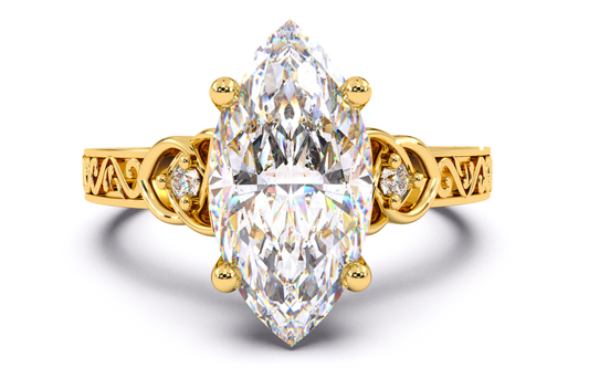 This cathedral setting and intricately detailed band bring a sense of refined luxury and romance to the piece, ideal for those who appreciate vintage-inspired elegance with a modern twist. The band’s smooth, polished finish ensures comfort and durability, while the artistic design gives the ring a sense of heritage and distinction.